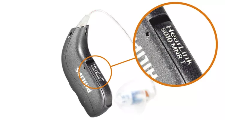 Identifique seu aparelho auditivo pela referência que se encontra escrita no modelo, conforme imagem abaixo. A escrita é bem pequena, por isso recomendamos que você use uma lupa ou tire uma foto com seu telefone e a amplie.